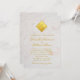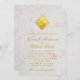 Above the text, there is a monogram inside a faux gold foil square. The monogram is formed by the 2 initials written in an elegant calligraphic script (the default ones are D and W). The background (and the back) is white marble. All text is golden. The names and the final phrase "Dinner and dancing to follow", written in an elegant calligraphic script.