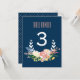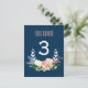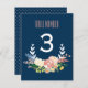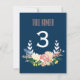 A fresh and modern illustrated floral wreath surrounds the table number on this colourful blush and navy floral table card.