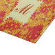 Script monogram framed with a trellis of autumn hued flowers and leaves in shades of gold, red, fuchsia and brown with a light yellow background