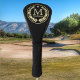 This attractive golf club cover features a gold laurel leaf wreath with your monogram at the center. Below the monogram is your name (first or last...your choice!) in matching gold. At the top of the design is a small gold star. Everything is placed on a dramatic black background. Classy!