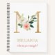 A beautiful monogram notebook with watercolor pink and white flowers, roses and peonies and green leaves and faux gold foil letter "M" with space for name and quote or motto!