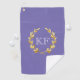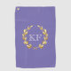 This golf towel is shown with a gold laurel wreath on a Purple background with custom monogram initials in White.