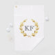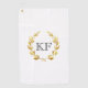 This golf towel is shown with a gold laurel wreath on a White background with custom monogram initials in Black.