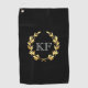 This golf towel is shown with a gold laurel wreath on a Black background with custom monogram initials in White.