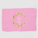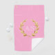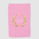 This golf towel is shown with a gold laurel wreath on a Pink background with custom monogram initials in White.