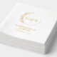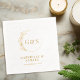 This elegant gold foil napkin features a clean and minimal design accented with a graphic of a leafy half wreath and the couples monogram, names and wedding date.