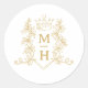 White and gold coloured monogram wedding or couples event sticker. Ideal for a white and gold themed wedding. Other matching wedding items available. © Monogram crest with a heart crown on top and entwined with berries and leaves original hand drawing and design by Sarah Trett for www.mylittleedenweddings.com exclusively on Zazzle.