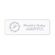 The left-hand side of this wedding invitation return address label features a monogram initial in indigo blue surrounded by a line art foliage wreath. Add your names in indigo blue classic script and the address below.