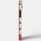 A custom phone case with a retro-style mid-century Christmas tree pattern of triangles, stars, snowflakes and diagonal stripes. Colours include; red, green, pink and white. This design can be personalised with an initial (monogrammed).
