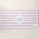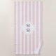 Beach towel featuring a light blush pink and white striped pattern with your monogram initials in dark grey over a white diamond shape. All colours are customisable.