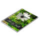 Monogram design with initials and name set against a photo, the centerpiece of which is a pretty white flower against green leaves.