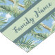 Customise this elegant floral table runner with a pattern of palm fronds and frangipani on a sky blue background with your family name. Perfect for decor with beach vibes.