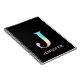 Chic personalised black notebook with a "J" initial monogram in large bold type with a pink, yellow, mint green and teal blue rainbow gradient. Add your name below in simple pink typography.