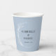 This paper cup design features a graphic of a white leaf wreath on a light dusty blue background. Personalise with the names of the bride and groom and their wedding date.