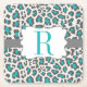 Chic, modern, pretty wild animal big cats leopard print paper coasters in aqua blue, white, and grey with a grey stripe and white with grey edged banner you can customise with your monogram initial!