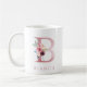 A floral personalised coffee mug with a name and rose pink monogram letter "B", and with a decorative watercolor foliage and flowers.