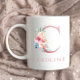 A floral personalised coffee mug with a name and rose pink monogram letter "C", and with a decorative watercolor foliage and flowers.