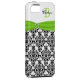 Monogrammed modern black and white damask pattern Case-Mate Vibe™ iPhone 5 Case with a lime green PRINTED ribbon and a PRINTED diamond jewel brooch. ****PLEASE NOTE that everything will print as it appears on your monitor. No one will edit it for mis-alignment, typos, etc. Customise it to add your name, initial, or other text. If you need assistance, email niteowlstudio@gmail.com.