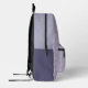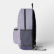 This backpack features a monogram patch in purples on the front over a multi-line weave-like plaid design in mauve, lilac and lavender purples, with solid purple half panels on he side.