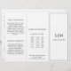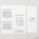 Simple trifold brochure featuring a modern and minimalist design. The front panel has your two initial monogram logo and your business name surrounded by a border. The back panel has your hours of operation and contact information. The inner fold panel has two headers and text boxes. NOTE: The foldlines on the front may be removed. The inside has multiple templates for information about your business on the outer panels and a price list in the middle panel. All text is black over a white background and the fonts and background colours may be changed to any colours you wish. This trifold brochure is great for a hair stylist, beauty salon or spa, but the classic style can be used for any business.