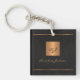 Luxury elegant black leather look keychain with a gold glitter monogrammed square and personalised name signature.