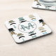 These fun drink coasters feature a pattern of top hats, moustaches, and bow ties on a white background. Colours include teal, light blue, tan, brown and black. A white circle banner at the centre holds your monogram in matching blue and your name written in black across it.