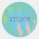 This custom name sticker features a bold monogram and full name layout in a sleek, minimal design — with a fresh color palette of white, green, gray, purple, and blue.