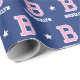 Elevate your gift-giving with monogrammed wrapping paper! This sports jersey-style pattern features a retro block-style font, stars, and is personalised with a monogram initial and the recipient's name. You can also customise the background colour by using the design editor tool. A cute design that would suit many occasions, including Christmas, birthdays, graduations and more — perfect for all ages, from kids and teens to family and friends! This seamless gift wrap is available with a matte or glossy finish. Printed colours: pink, dark blue navy and white.