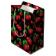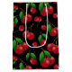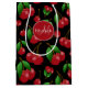 Cute cherries pattern gift bag features paired and single cherries with intact stems and green leaves as if just picked from the cherry tree - black background is customisable, as is her name and monogram - by katz_d_zynes