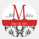 Monogram Names Date Damask Wedding Red White Classic Round Sticker