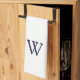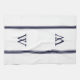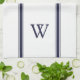 Monogram navy blue striped personalized kitchen towel. Navy blue monogram in classic block text on top and botton border within navy blue striped outer panels. White background.