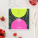 Neon yellow and pink arches over cardstock inspired colour scheme dark palm leaf background with monogram in black and white line art palm tree illustration with date in white.