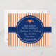The design features an alternating orange and white stripes pattern on the background. Also the design features bride's and groom's initials separated by an orange heart. An elegant striped pattern and in the middle there is a royal blue circle where to add your text. Wedding save the date postcards.