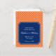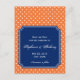 Monogrammed orange and white polka dot pattern with royal blue accent save the date postcards. Small white polka dots on orange and in the middle there is a royal blue rectangle to add your text.