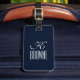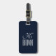 Luggage tag, featuring a customisable monogram navy blue and white design, based on typography.