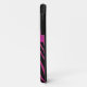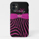 Monogrammed modern black and fuchsia pink FAUX glitter zebra print stripe pattern iPhone 5 Barely There Case-Mate brand case with PRINTED ribbon and PRINTED jewel brooch. Customise it to add your name, initial, or other text. If you need assistance, email niteowlstudio@gmail.com.