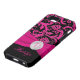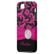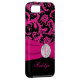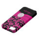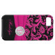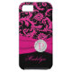 Monogrammed modern hot pink, black, and silver floral damask pattern Case-Mate Vibe™ iPhone 5 Case with PRINTED ribbon and PRINTED faux engraved look crystal brooch. Customise it to add your name, initial, or other text. If you need assistance, email niteowlstudio@gmail.com.
