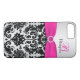 Monogrammed modern hot pink, black, and silver damask iPhone 7 case with PRINTED ribbon and PRINTED jewel brooch. it to add your name, initial, or other text. If you need assistance, email niteowlstudio@gmail.com.