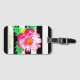 Monogram Pink Peony Black & White Luggage Tag. Pink watercolor peony with green leaves and a small yellow flower, black & white stripes, and golden monogram. Modern, remarkable & elegant.