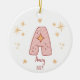 Celebrate your baby girl's first Christmas with this charming monogram ornament. Baby Girl's First Christmas Monogram with Photo Ceramic Ornament. Featuring a large monogram letter "A" with customisable name and year, this ornament is perfect for families welcoming their new little one. Add your baby’s photo on the back to make this a treasured keepsake for years to come. Order today to create lasting memories!