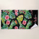 A Colourful Floral Beach Towel ready for a very Tropical atmosphere with Exotic Flowers, Pink Hibiscus and Palm Leaves on a black background. To brighten your Summer Days anywhere you go. You can make it unique by adding your own Monogram and name from the Personalise Menu. You can contact me for any help.
