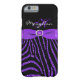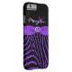 Monogrammed modern purple and black FAUX glitter zebra stripe pattern iPhone 6 case Barely There brand case with PRINTED ribbon and PRINTED jewel brooch. it to add your name, initial, or other text. If you need assistance, email niteowlstudio@gmail.com.
