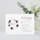 This wedding design features the bride and groom's monogram initials in purple framed by a watercolor wreath of purple and blush spring flowers and green foliage on the left-hand side. Customise the right-hand text, with room for an online RSVP option with website URL.