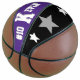 This is a full size basketball with two panels designed with a monogram name (large first letter) and uniform number, in popular college colours. This one is shown in purple, grey, and white. The second panel has team colours with three stars. All text, art, and colours can be removed, or changed as desired. One panel can be left white for autographs, etc.