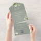 This chic greenery floral all-in-one wedding invitation can be personalised with your monogram initials and wedding day information on a sage green background. The invitation includes a perforated RSVP card that features your wedding website QR code. Designed by Thisisnotme©
