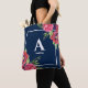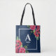 Monogram Red and Pink Flowers Dark Navy Blue Tote Bag