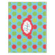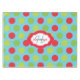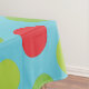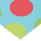 Big polka dots of lime, green, and red on an aqua blue background Christmas holiday tablecloth with a centre framed banner of white and red with red text area to add your surname, blue text area to add your monogram initial!