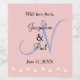 Monogram in light blue elegant script against pastel rose background. Wedding Favours with ith the wording, With Love From, insert Bride and Groom's First Names, Wedding Date in black text. Small cream polka dots at the bottom. Original Design by TamiraZDesigns.