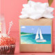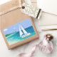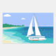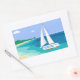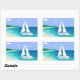 Monogram Sailboat Coastal Tropical Beach Stickers. A sailboat with your name on it approaching a beach. Tropical sea view. Blue, teal, sea foam, turquoise, green, white.
