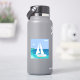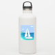 A sailboat (a yacht) with your name on it approaching a beach. Sunny day by the ocean. Tropical sea view. A shore with green palm trees. Blue, teal, sea foam, turquoise, green, white. Very dresh and modern.